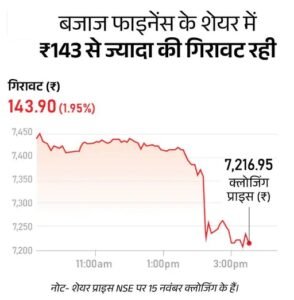 शेयर बाजार बंद होने के बाद, RBI ने ‘eCOM’ और ‘इंस्टा EMI’ के माध्यम से लोन की मंजूरी और विपणन पर रोक लगाई है। इसलिए आज इसके शेयर पर इस फैसले का कोई प्रभाव नहीं देखा गया है। इस रोक के कारण बजाज फाइनेंस के शेयर में कल यानी 16 नवंबर को भारी गिरावट देखने को मिल सकती है। हालाँकि, बजाज फाइनेंस का शेयर आज भी 1.95% की गिरावट के साथ निफ्टी 50 का टॉप लूजर रहा।